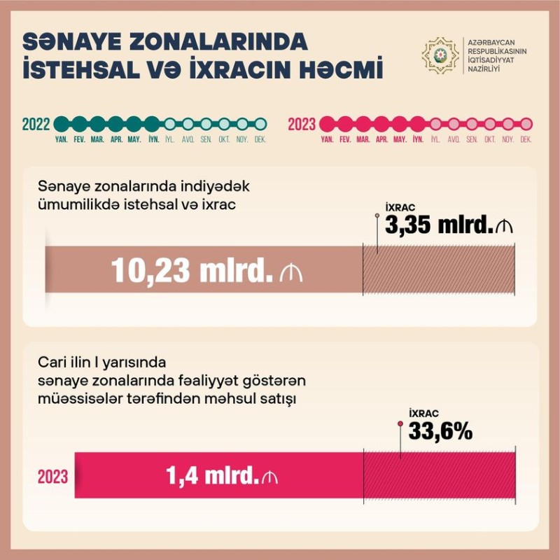 Sənaye zonalarında bugünədək ümumilikdə 10,23 milyard manatlıq məhsul istehsal edilib ki, bunun 3,35 milyard manatlıq hissəsi ixrac olunub. “Made In Azerbaijan” brendi adı ilə dünyanın 60-a yaxın ölkəsinə ixrac həyata keçirilir. Cari ilin I yarısında sənaye zonalarında fəaliyyət göstərən müəssisələr tərəfindən 1,4 milyard manatlıq məhsul satılıb ki, bunun 33,6%-lik hissəsi ixracın payına düşür.