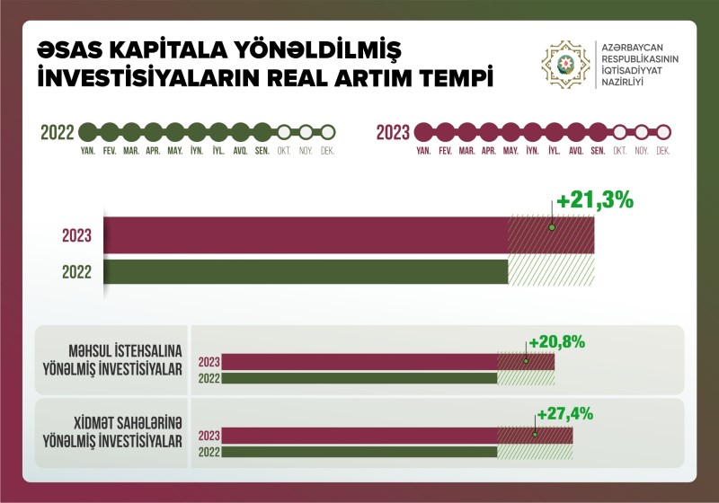 Bu ilin yanvar-sentyabr aylarında əsas kapitala yönəlmiş investisiyaların real artım tempi ötən ilin eyni dövrünə nisbətən 21,3% olub.