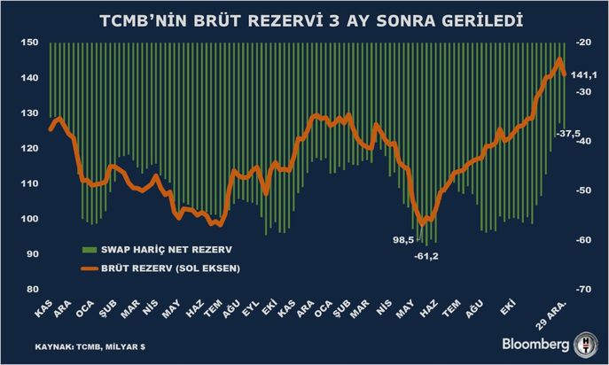 Türkiyə Cümhuriyyəti Mərkəzi Bankının (TCMB) cəmi ehtiyatları 13 həftədən sonra ilk dəfə azalıb. Ümumi ehtiyatlar 145 milyard 453 milyon dollardan 141 milyard 60 milyon dollara düşüb.