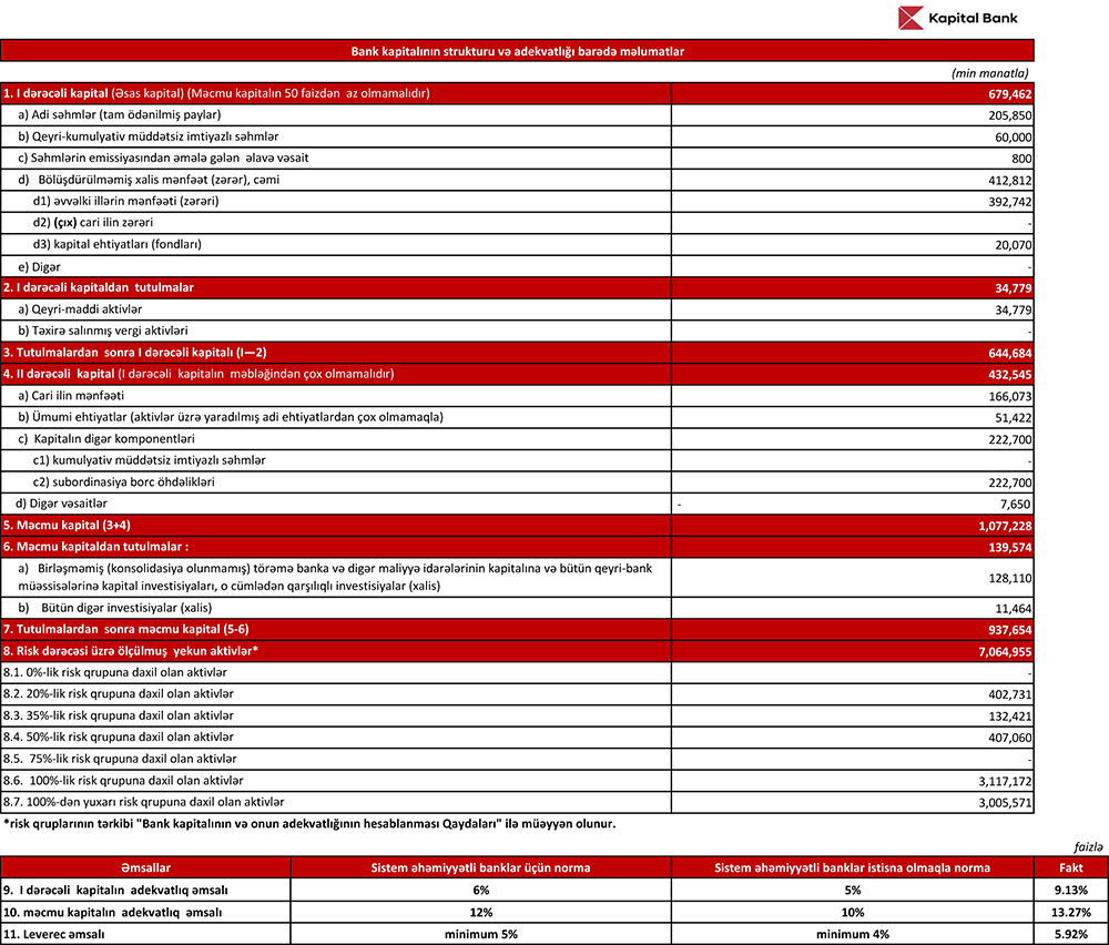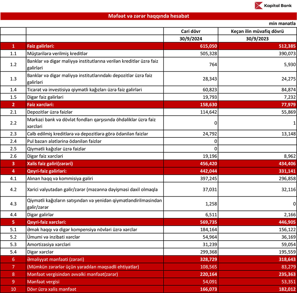 "Kapital Bank" ASC 2024-cü ilin 9 ayını (yanvar-sentyabr) 166 milyon 73 min manat xalis mənfəət ilə başa vurub. Bank 2023-cü ilin 9 ayını 182 milyon 12 min manat xalis mənfəət ilə bağlamışdı. Xalis mənfəətdəki 15 milyon 939 min manatlıq və ya 8,7% azalma mümkün zərərlər üçün yaradılan məqsədli ehtiyatlara ayrılan vəsaitin artması ilə əlaqədardır. 9 ay ərzində "Kapital Bank"ın kredit portfeli, gəlirləri, əməliyat mənfəəti artıb.