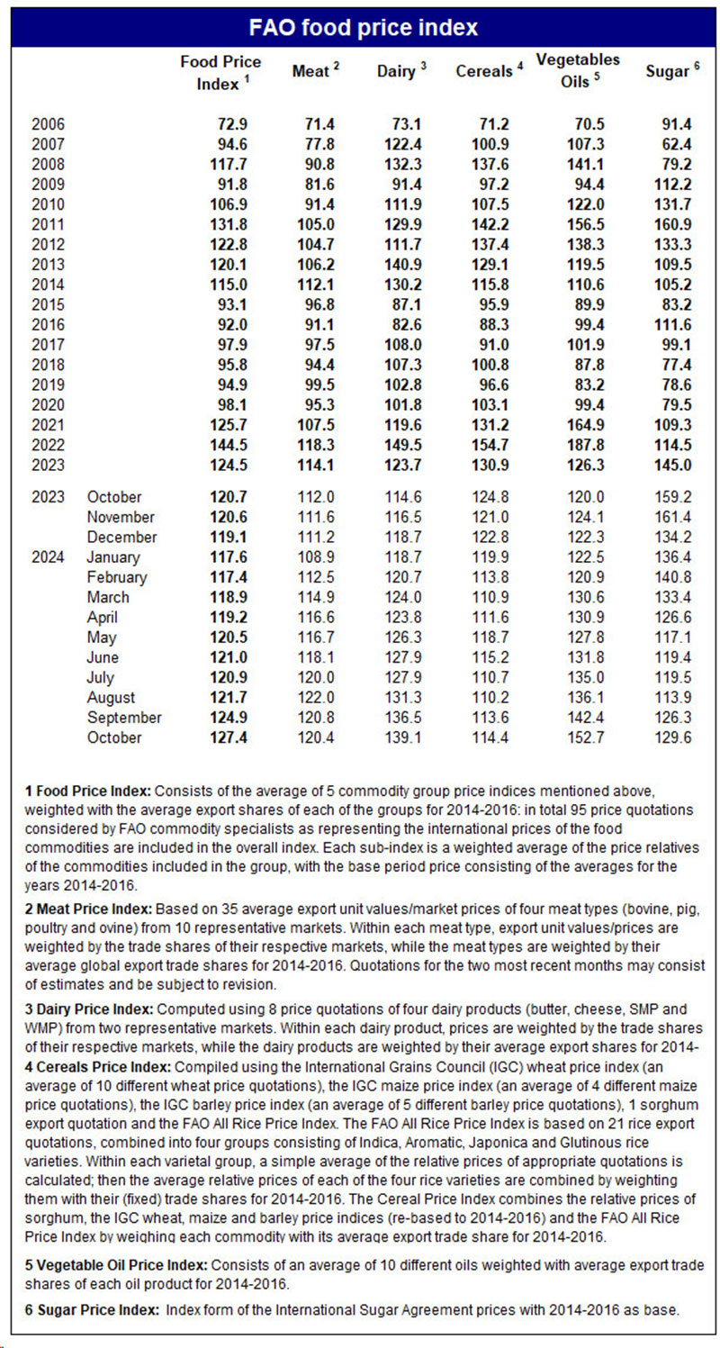 FAO-nun məlumatları göstərib ki, indeks bir il əvvələ (2023-cü ilin oktyabr ayına) nisbətən 5,5 faiz artaraq 2023-cü ilin aprelindən bəri ən yüksək səviyyəyə çatıb. Rusiya-Ukrayna müharibəsi başlayandan sonra 2022-ci ilin martında indeks 160,2 bəndə çataraq rekord qırmışdı.