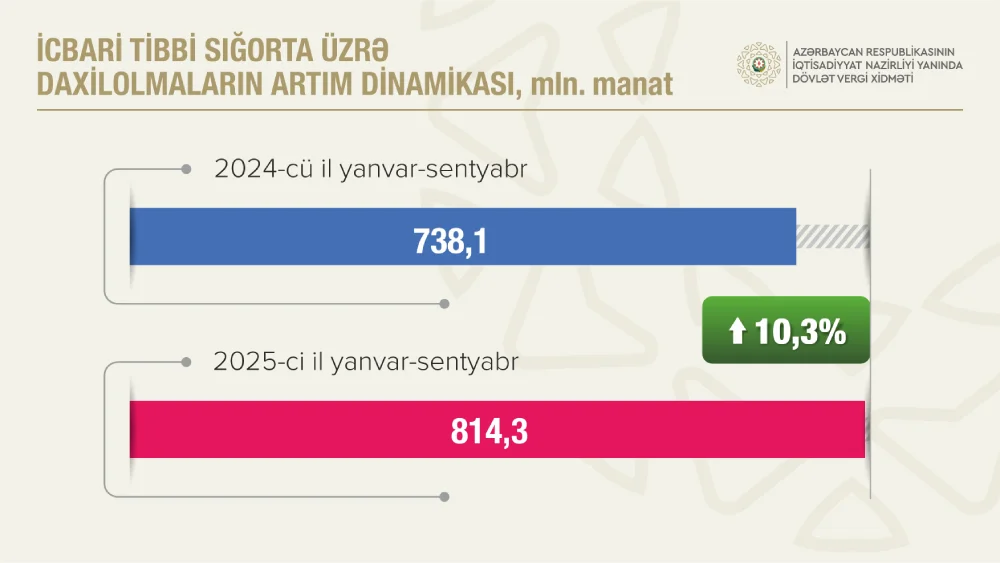 İcbari tibbi sığorta haqları üzrə daxilolmalar ötən ilin eyni dövrünə nisbətən 10,3 faiz artıb və 814,3 milyon manatdan çox təşkil edib. Qeyri-büdcə təşkilatları üzrə daxilolmalar 9,9 faiz artaraq 576,8 milyon manat olub.