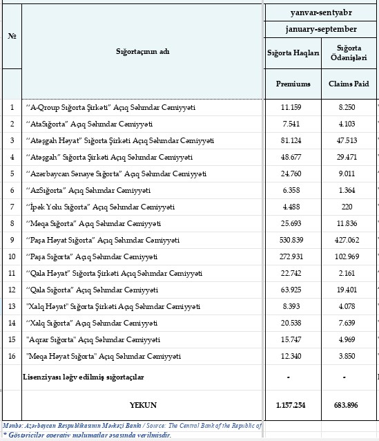 2025-ci ilin yanvar-sentyabr ayları ərzində sığorta haqları 133 milyon 547 min manat, sığorta ödənişləri isə 130 milyon 150 min manat artıb.2025-ci ilin yanvar-sentyabr ayları ərzində (cari ilin 9 ayında) Azərbaycanda fəaliyyət göstərən 16 sığorta şirkəti tərəfindən 1 milyard 157 milyon 254 min manat sığorta haqları hesablanıb.