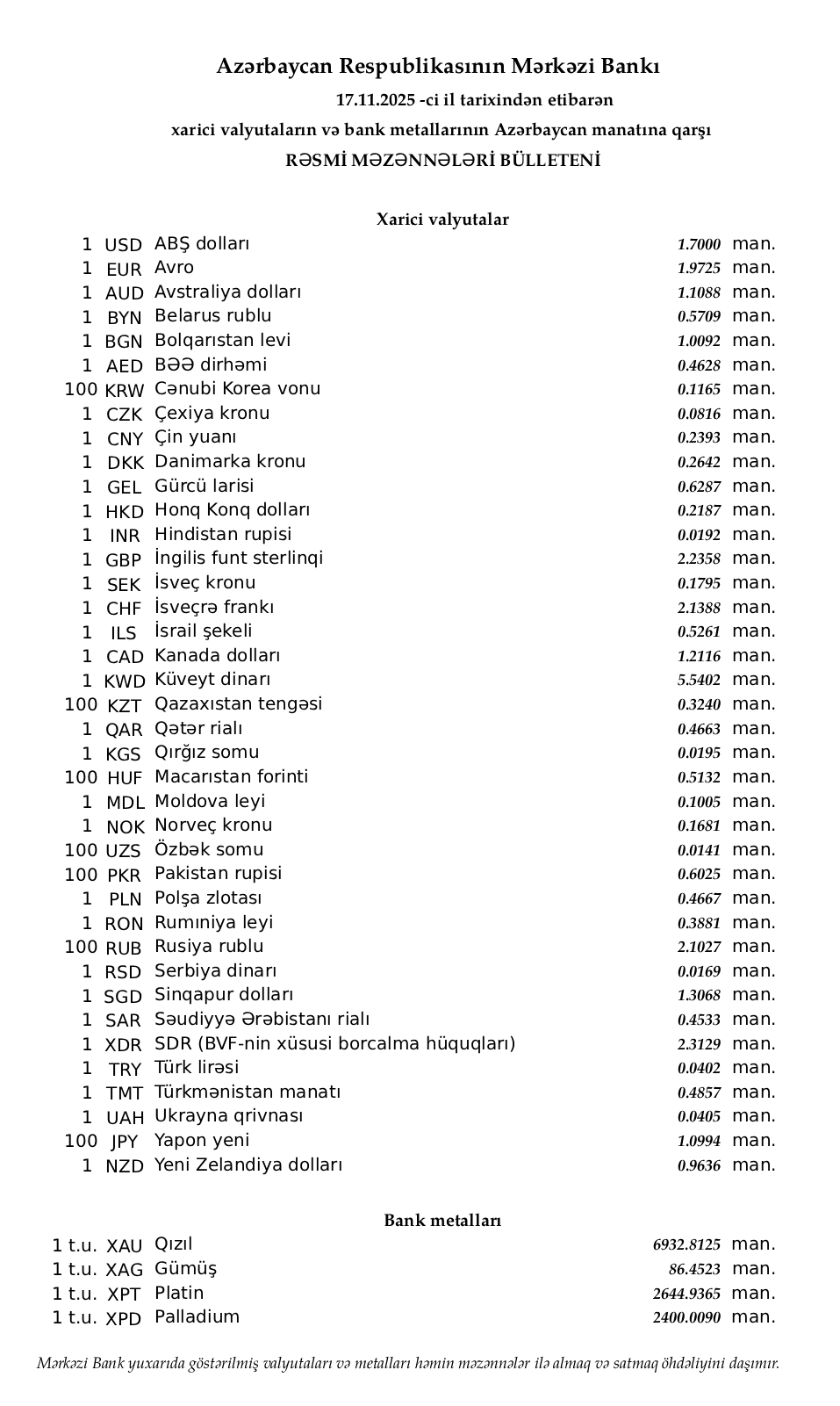 Dolların bazar ertəsi üçün rəsmi məzənnəsi müəyyən olunub