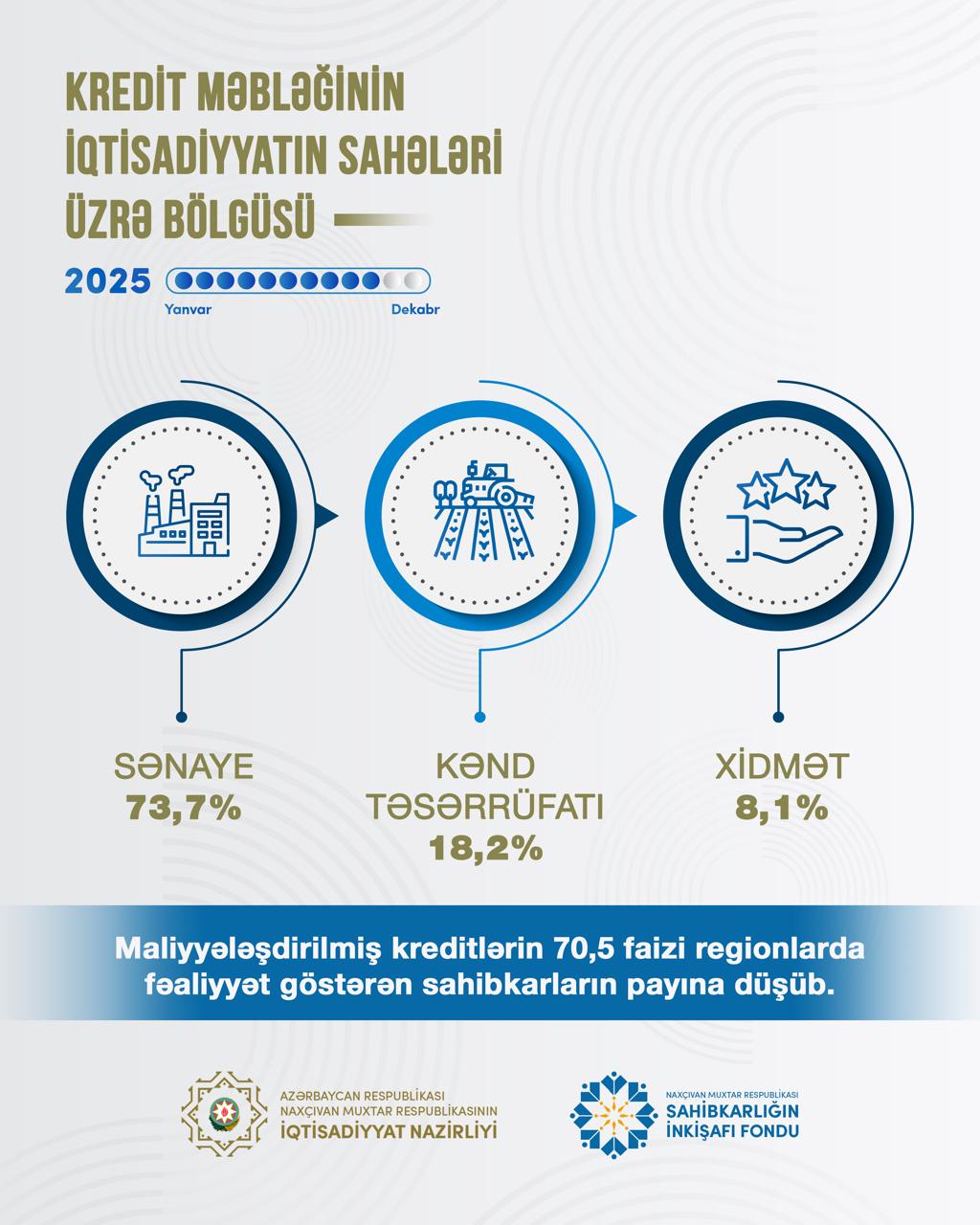 2025-ci ilin yanvar–oktyabr aylarında verilmiş kreditlərin ümumi məbləğinin 73,7 faizi sənayenin, 18,2 faizi kənd təsərrüfatının, 8,1 faizi isə xidmət sahələrin payına düşüb.