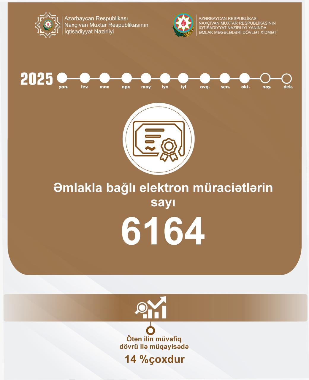 2025-ci ilin yanvar-oktyabr aylarında hüquqi və fiziki şəxslər, həmçinin notariat ofisləri tərəfindən Əmlak Məsələləri Dövlət Xidmətinə 6164 elektron müraciət daxil olub. Bu da ötən ilin analoji dövrü ilə müqayisədə 14 faiz artım deməkdir.