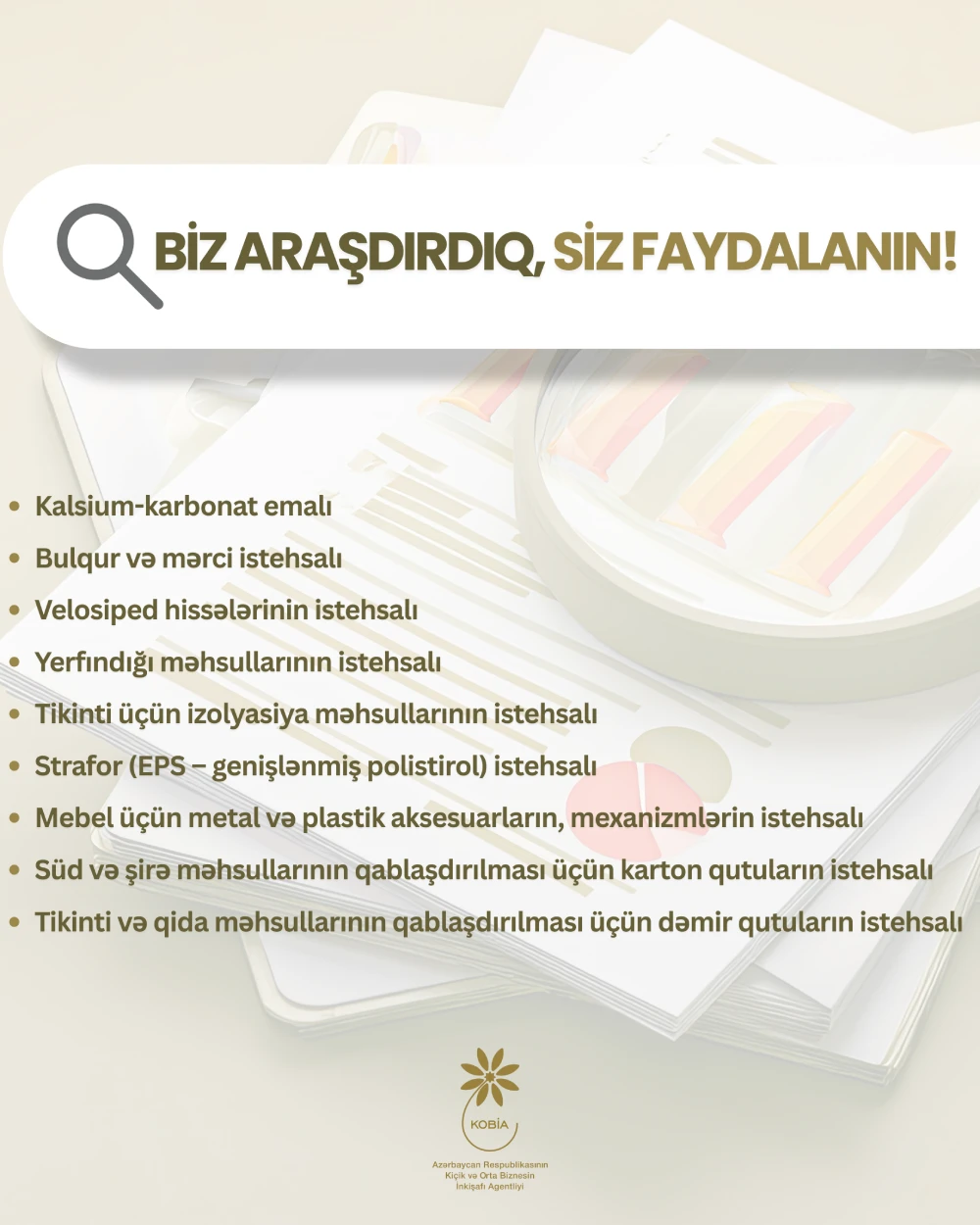 Kiçik və Orta Biznesin İnkişafı Agentliyinin (KOBİA) təşəbbüsü ilə sahibkarlar üçün bazarın tələbatına uyğun olaraq 9 istiqamət üzrə daxili bazar araşdırmaları aparılıb. Araşdırmalar aşağıdakı sahələri əhatə edir: