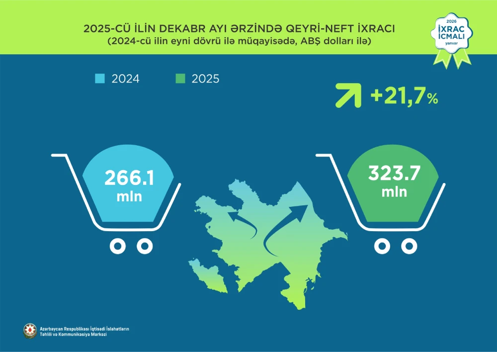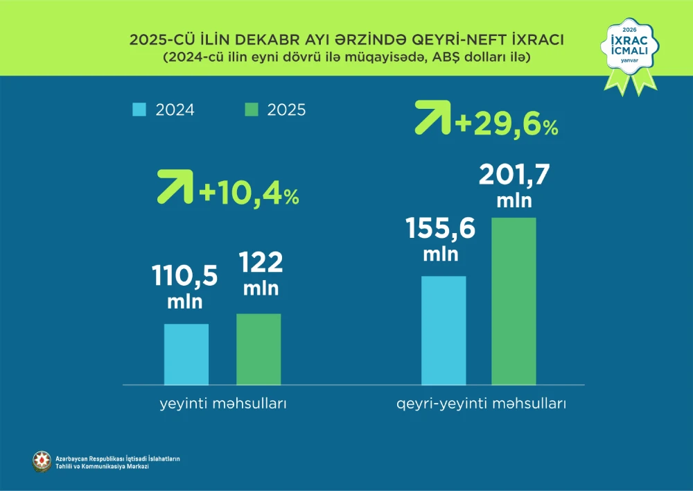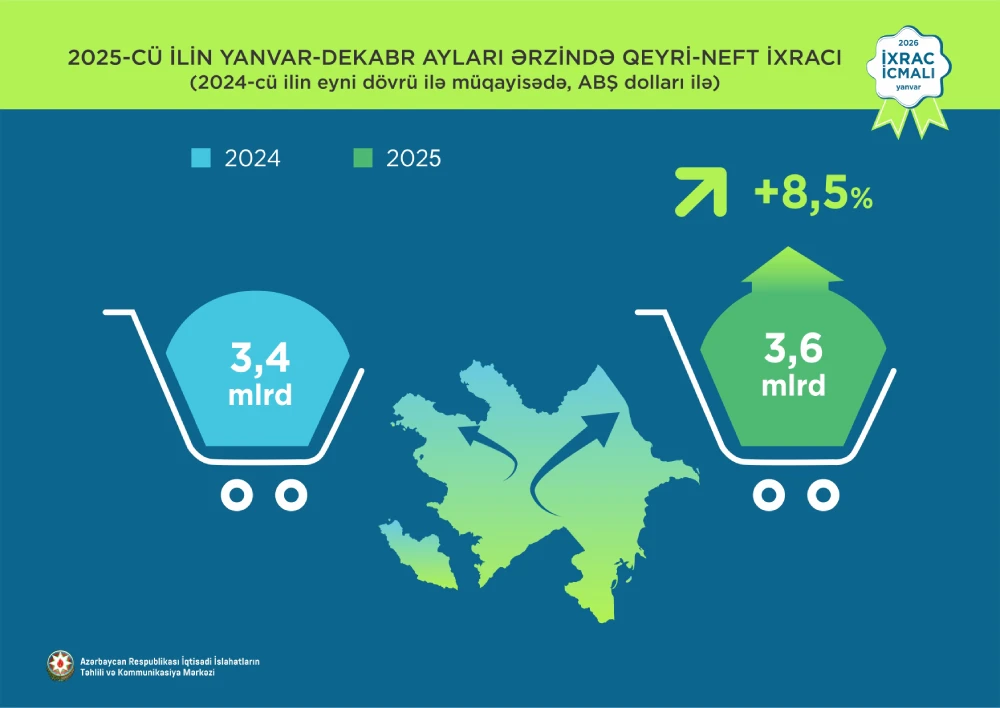 Marja xəbər verir ki, İcmala əsasən, 2025-ci ilin yanvar-dekabr aylarında Azərbaycanın qeyri-neft sektoru üzrə ixracı 2024-cü ilin müvafiq dövrü ilə müqayisədə 8,5% artaraq 3,6 milyard ABŞ dolları təşkil edib. 2025-ci ilin yanvar-dekabr aylarında yeyinti məhsulları üzrə ixrac 18,4% artaraq 1,2 milyard ABŞ dollarına bərabər olub.