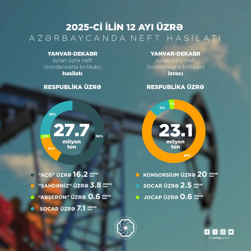 Azərbaycan Energetika Nazirliyi 2025 neft-qaz göstəriciləri neft hasilatı 2025 “Azəri-Çıraq-Günəşli” neft hasilatı “Şahdəniz” qaz hasilatı “Abşeron” yatağı hasilatı SOCAR hasilatı xam neft və kondensat gündəlik neft hasilatı neft ixracı 2025 konsorsium neft ixracı JOCAP ixrac payı neft emalı həcmi təbii qaz hasilatı 2025 qaz ixracı 2025 Avropa qaz ixracı Türkiyə qaz ixracı TANAP qaz həcmi Gürcüstan qaz ixracı Suriya qaz ixracı ümumi neft və qaz hasilatı Azərbaycan enerji sektoru Marja.az xəbərləri qaz və neft tarixi göstəricilər Azərbaycan enerji statistikası neft-qaz sənayesi göstəriciləri strateji enerji resursları qaz və neft ixracı statistikası.