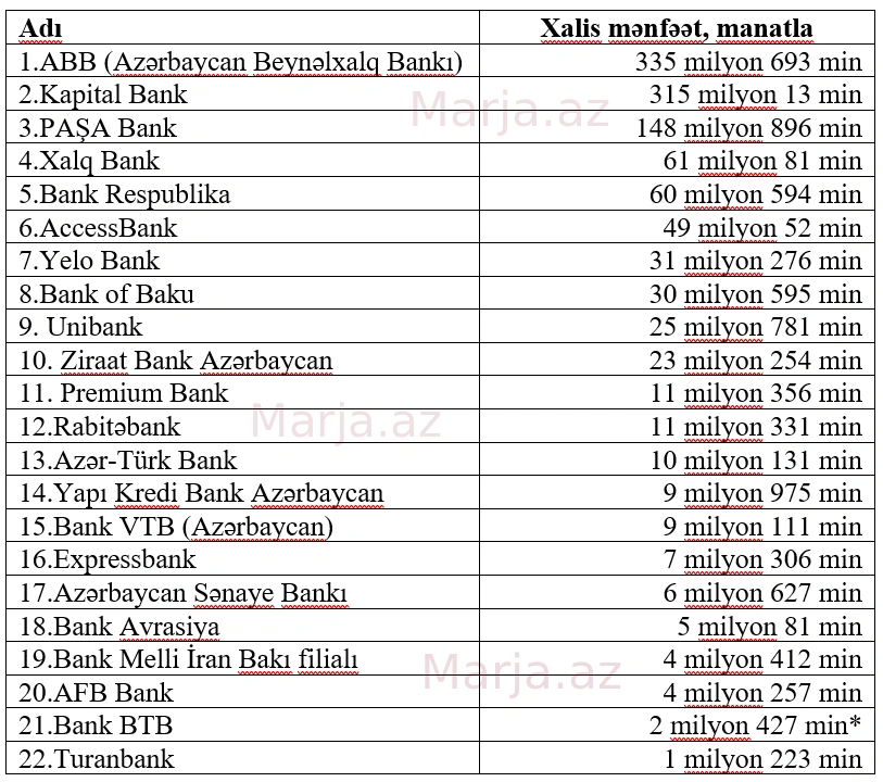 2025-ci ildə Azərbaycanda fəaliyyət göstərən bankların əldə etdikləri xalis mənfəətin məbləğinə görə sıralaması