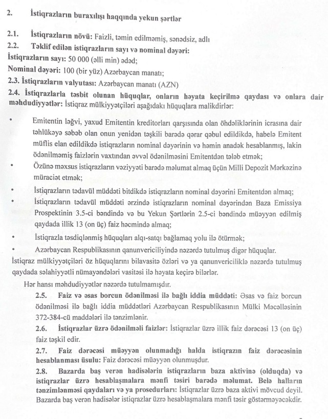 Marja.az Baza emissiya prospektinə istinadən xəbər verir ki, hər birinin nominal dəyəri 100 manat olan 50 min ədəd faizli, təmin edilməmiş, sənədsiz, adlı istiqrazlar buraxılır.