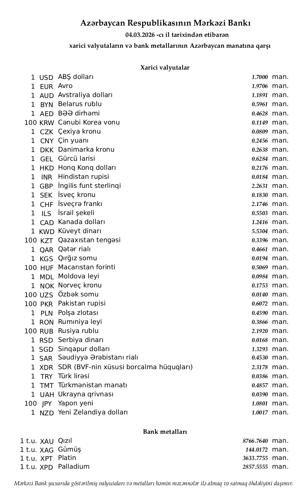 Rəsmi məzənnələr açıqlandı