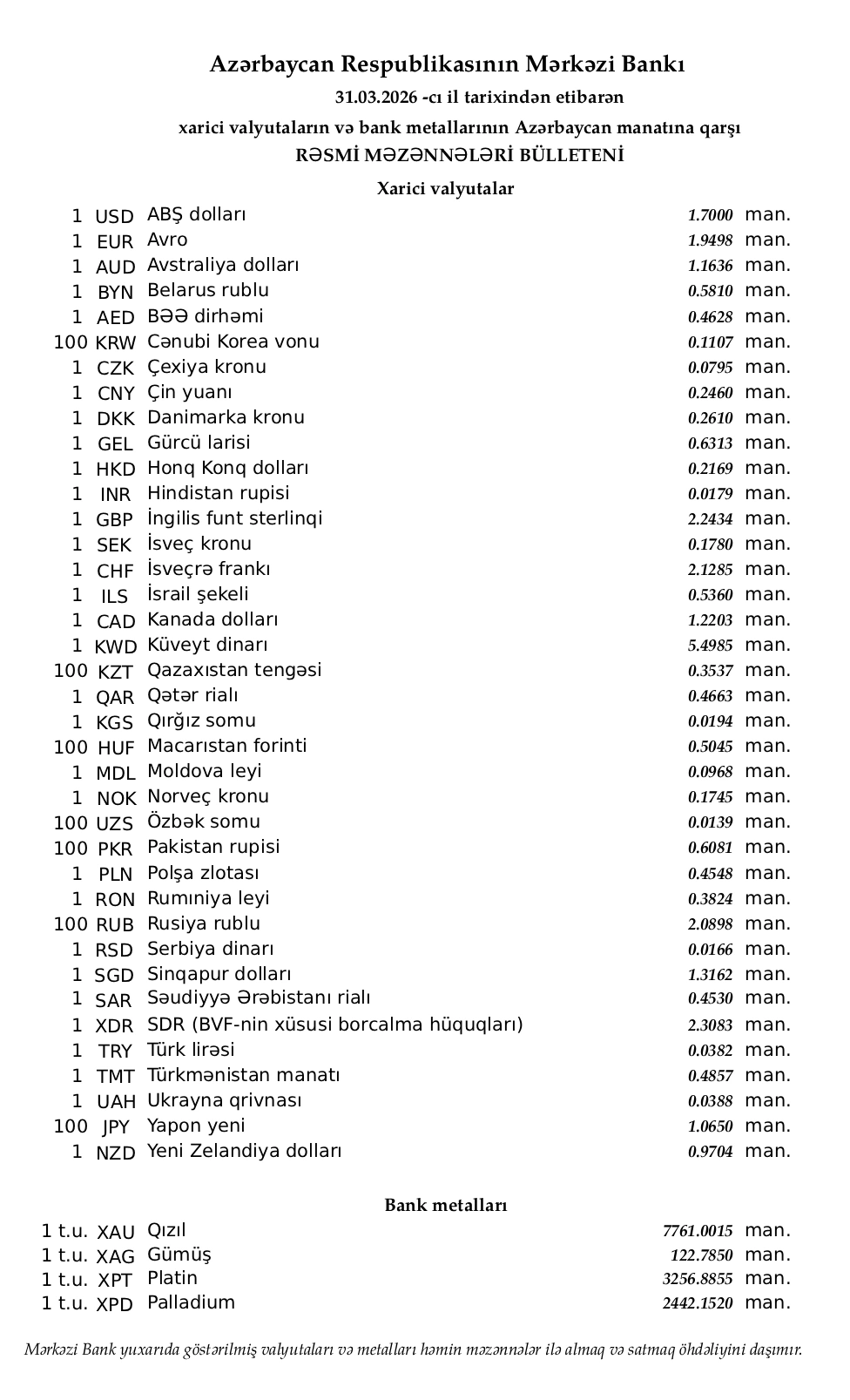 Rəsmi məzənnələr açıqlandı