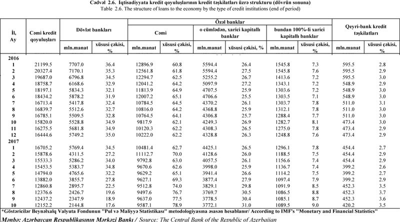 2017-ci ilin Oktyabr ayının sonuna bankların və bank olmayan kredit təşkilatlarının cəmi kredit qoyuluşları 12 milyard 152.2 milyon manat təşkil edib.