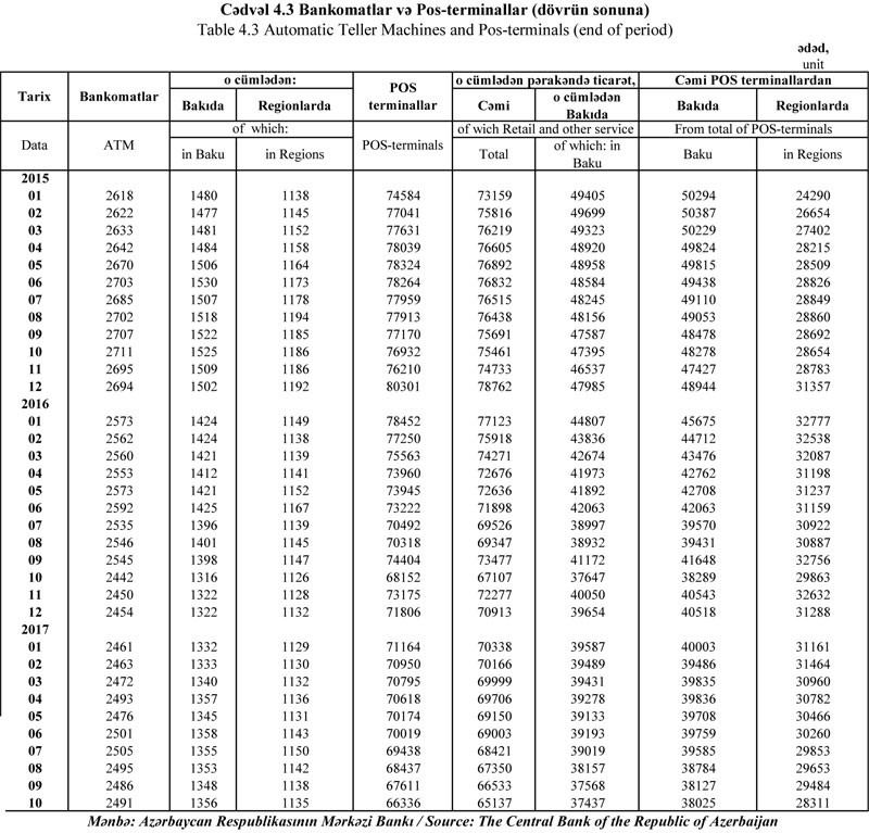 2015-ci ilin sonunda POS-terminalların sayı 80301 ədədə çatmışdı. Son 1 il 10 ayda POS-terminalların sayı 13 min 965 ədəd azalıb.