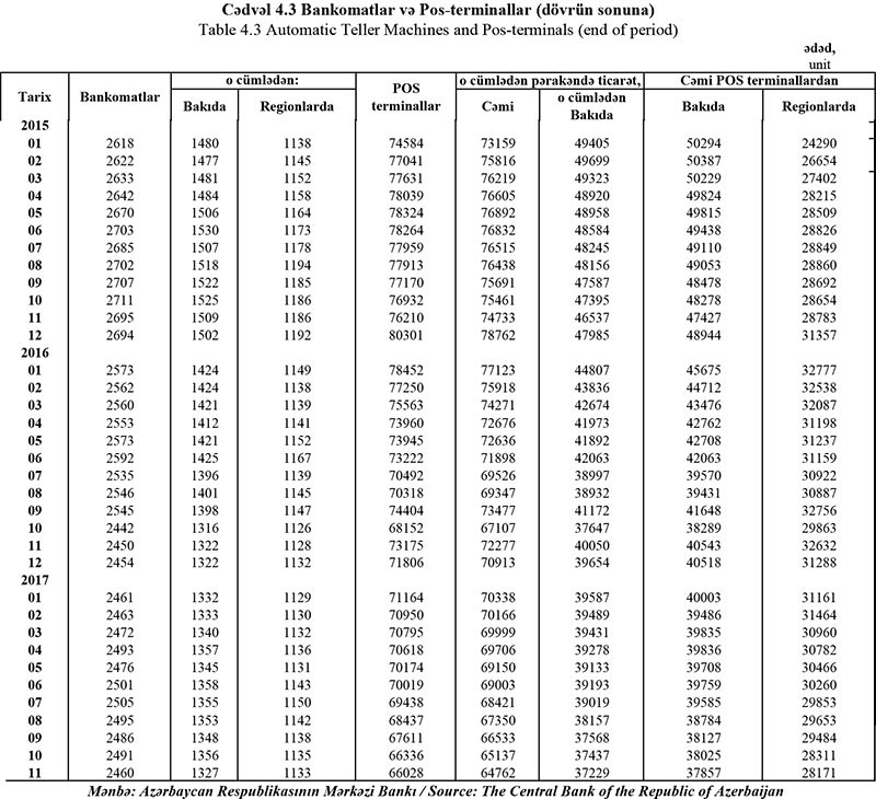 Azərbaycanda 2015-ci ilin sonunda 80301 ədəd olan POS-terminal sayı 2017-ci ilin Noyabr ayınadək 66028 ədədə düşüb.