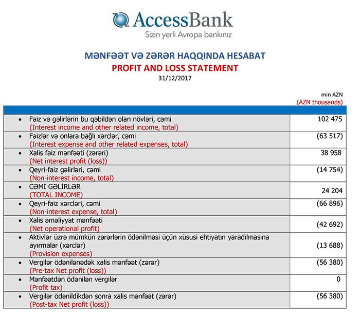 2016-cı ildə “AccessBank”ın cəmi gəlirləri 172 milyon 117 min manat, o cümlədən faiz gəlirləri 135 milyon 512 min manat, qeyri-faiz gəlirləri 36 milyon 605 min manat təşkil etmiş, 138 milyon 447 min manat faiz və qeyri-faiz xərcləri çıxıldıqdan sonra 33 milyon 670 min manat xalis əməliyyat mənfəəti qalmışdı. Lakin bank ehtiyatlara böyük məbləğdə ayırma etdiyindən həmin ili 90 milyon 223 min manat zərər ilə başa vurmuşdu.