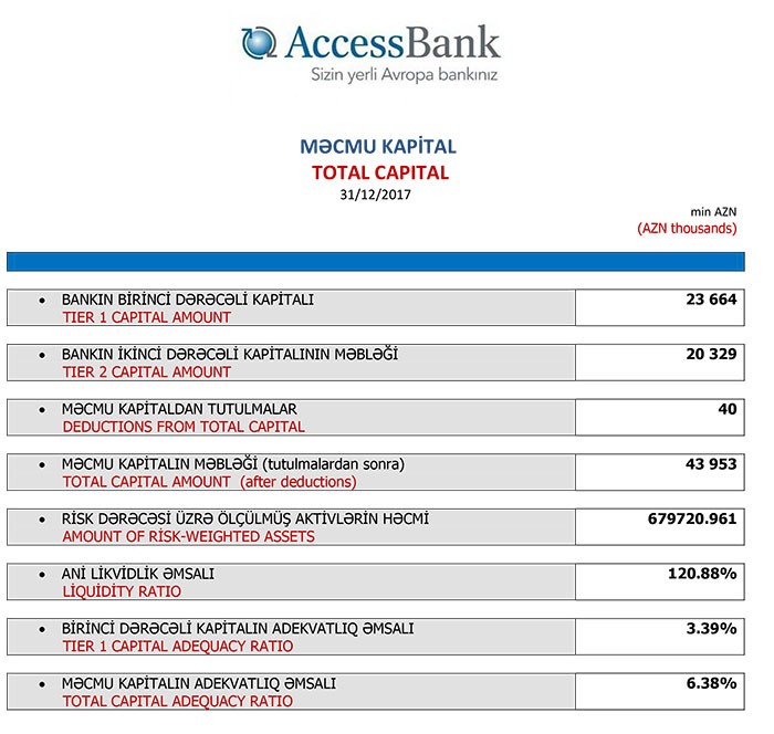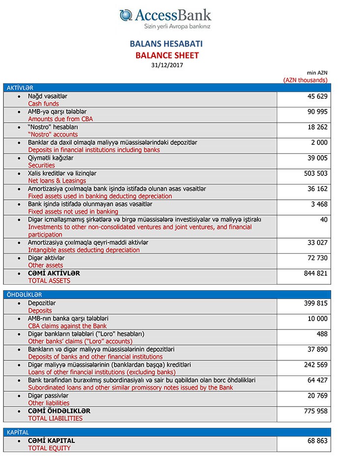 31 Dekabr 2017-ci il tarixində “AccessBank”ın cəmi aktivləri 844 milyon 821 min manat, cəmi öhdəlikləri 775 milyon 958 min manat, cəmi balans kapitalı 68 milyon 863 min manat təşkil edib.