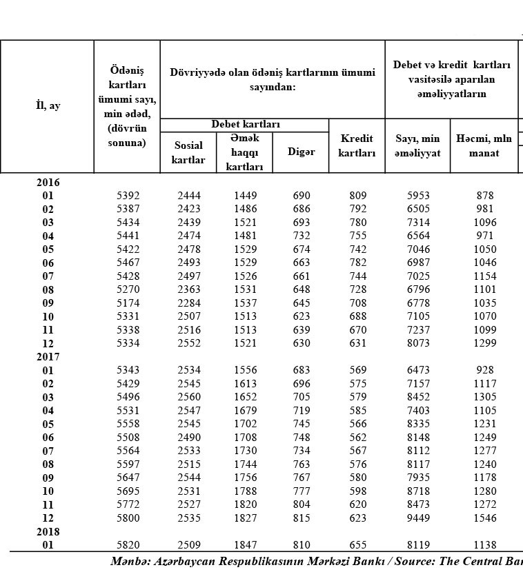 Əməkhaqqı kartları isə 20 min ədəd artaraq 1 milyon 847 min ədədə, kredit kartları isə 32 min ədəd artaraq 655 min ədədə çatıb.