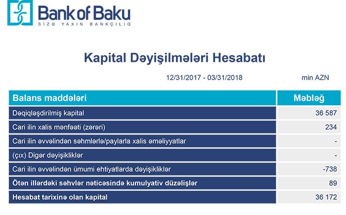 2017-ci ilin 1-ci rübünü 3 milyon 538 min manat zərər ilə bağlamış “Bank of Baku” 2018-ci ilin 1-ci rübünü 234 min manat xais mənfəət ilə başa vurub.