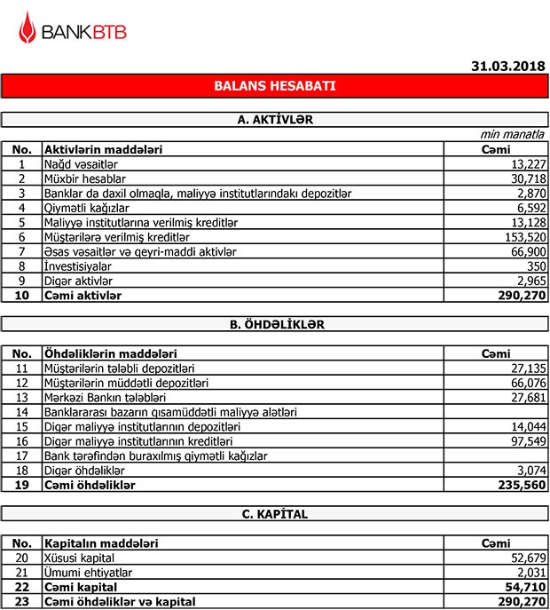 31.03.2018-ci il tarixində “Bank BTB” 290 milyon 270 min manat cəmi aktivlərə, 235 milyon 560 min manat cəmi öhdəliklərə və 54 milyon 710 min manat cəmi balans kapitaına malik olub.