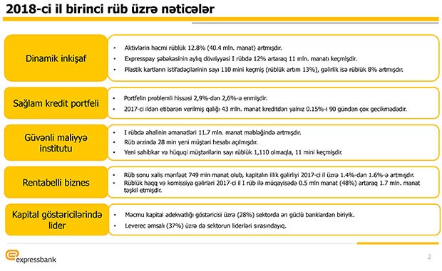 2018-ci ilin ilk rübündə Bankın əməliyyat mənfəəti 7 milyon 29 min manat, ümumi inzibati xərclər isə  6 milyon 280 min manat təşkil edib. Nəticədə Bank ilk rübü 749 min manat xalis mənfəətlə bağlayıb.
