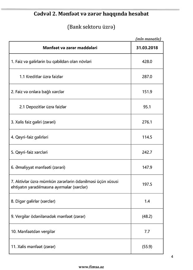 2018-ci ilin 1-ci rübünü 7 bank zərər ilə başa vurub. 7 bankın birlikdə zərəri 23 bankın mənfəətini üstələyib. Bu səbəbdən bank sektoru üzrə yekun nəticə mənfidir.