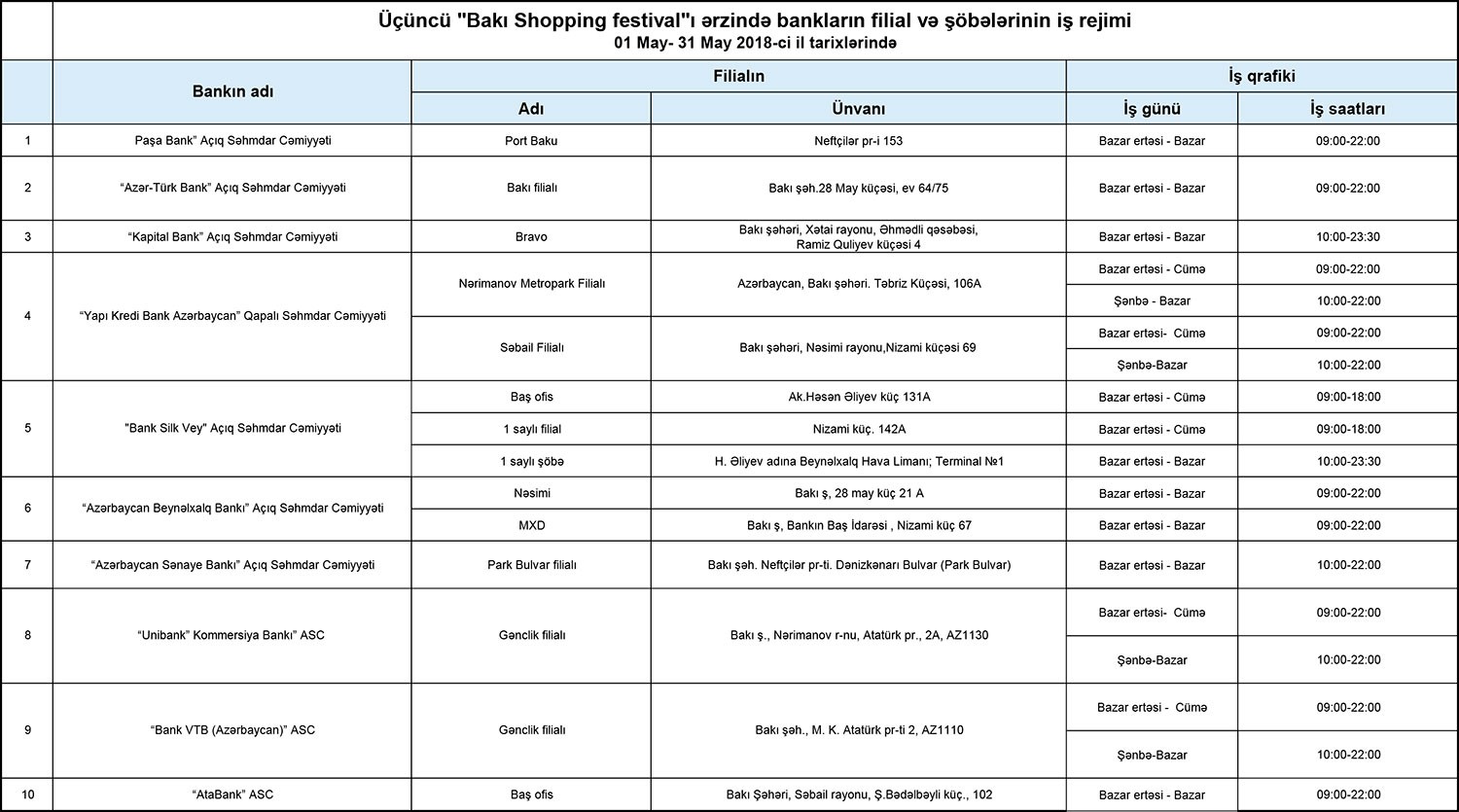 Üçüncü dəfə keçirilən Bakı Ticarət Festivalı (“Baku Shopping Festival”) zamanı Maliyyə Bazarlarına Nəzarət Palatasının (Palata) tövsiyəsi ilə 23 bankın 48-dən çox filial və şöbəsi gücləndirilmiş iş rejimində fəaliyyəti davam etdirir.