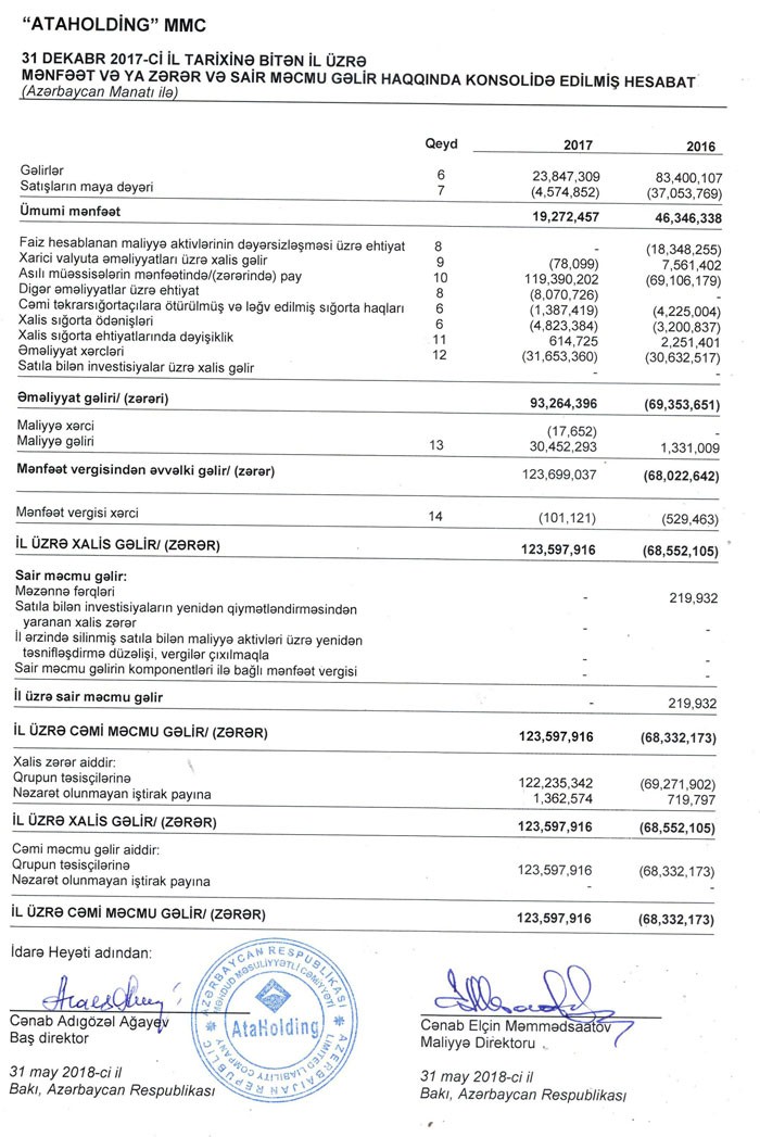 Ötən il “AtaBank”ın tərkibindən çıxdığı “AtaHolding” MMC 2017-ci ili 123 milyon 597 min manat xalis mənfəətlə başa vurub. Halbuki holdinq, 2016-cı ildə 68 milyon 332 min manat zərər açıqlamışdı.