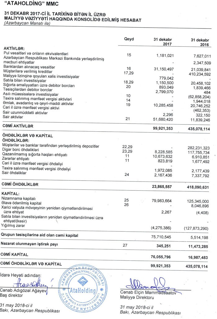 “AtaHoldinq”in cəmi aktivləri 2016-cı ilin sonundakı 435 milyon 78 min manatdan 2017-ci ilin sonunda 99 milyon 921 min manata düşüb. Səbəb ötən il “AtaBank”ın “Synergy Group”un tərkibinə keçməsilə əlaqədar olaraq müştərilərə verilmiş 410 milyon 234 min manat kreditlərin bu ilin balansında əks olunmamasıdır.
