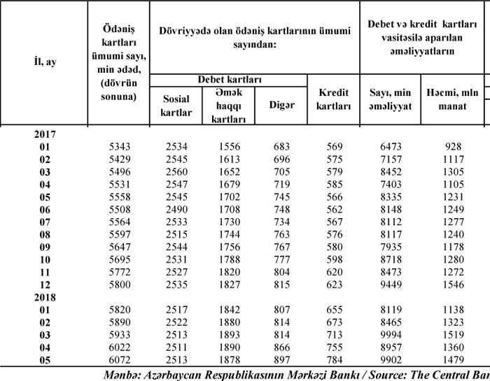 2018-ci ilin May sonunda cəmi ödəniş kartlarının sayı 6 milyon 72 min ədəd təşkil edib.