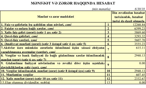 Bank 615 min manat aktivlər üzrə mümkün zərərlərin ödənilməsi üçün xüsusi ehtiyatın yaradılmasına ayırıb, həmçinin, 607 min manat mənfəət vergisi ödəyin.
