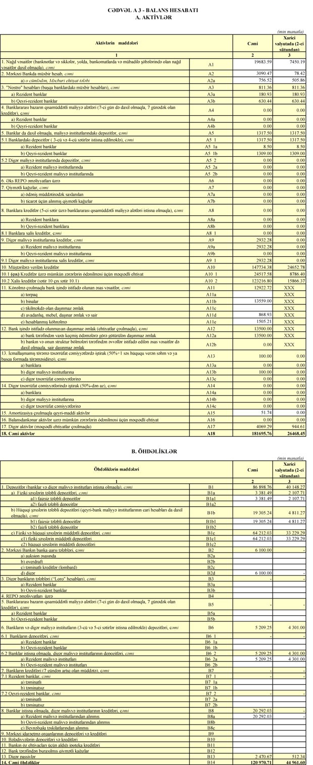 Xərclər çıxıldıqdan sonra Bankın 3 milyon 916 min manat əməliyyat mənfəəti qalıb. Əməliyyat mənfəətinin 3 milyon 299 min manatı aktivlər üzrə (ehtimal olunan kredit və depozit itkiləri üzrə ) mümkün zərərlərin ödənilməsi üçün xüsusi ehtiyatın yaradılmasına ayrıldığından Bankın xalis mənfəəti 617 min manat təşkil edib.