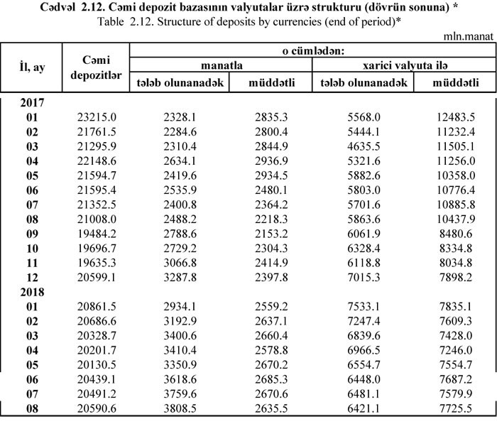 Həmin tarixə, cəmi depozitlərin 6 milyard 444 milyon manatı milli valyutada (3 milyard 808.5 milyonu tələb olunanadək, 2 milyard 635.5 milyon manatı müddətli), 14 milyard 146,6 milyon manatı xarici valyutada olub (6 milyard 421.1 milyon manatı tələb olunanadək, 7 milyard 725.5 milyon manatı müddətli).