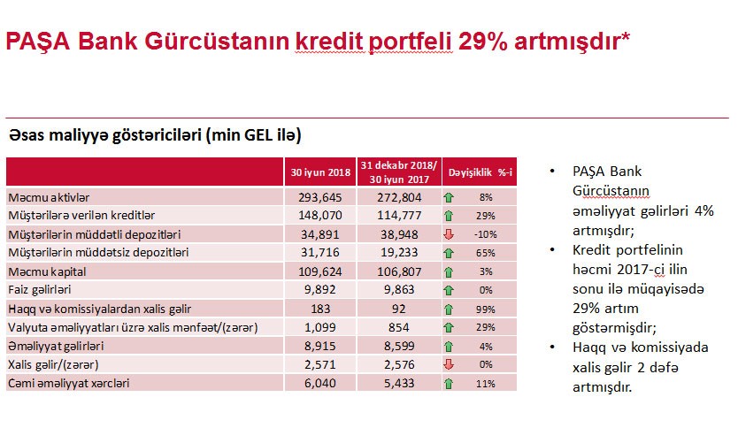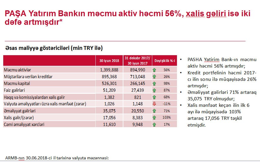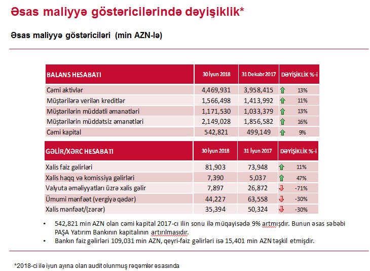 Azərbaycanın aparıcı korporativ bankı olan PAŞA Bank 30 iyun 2018-ci il tarixinə bitən 6 ay üzrə özünün və törəmə banklarının (PASHA Bank Georgia və “PASHA Yatırım Bankası A.Ş.) maliyyə nəticələrini mətbuat konfransında açıqladı.