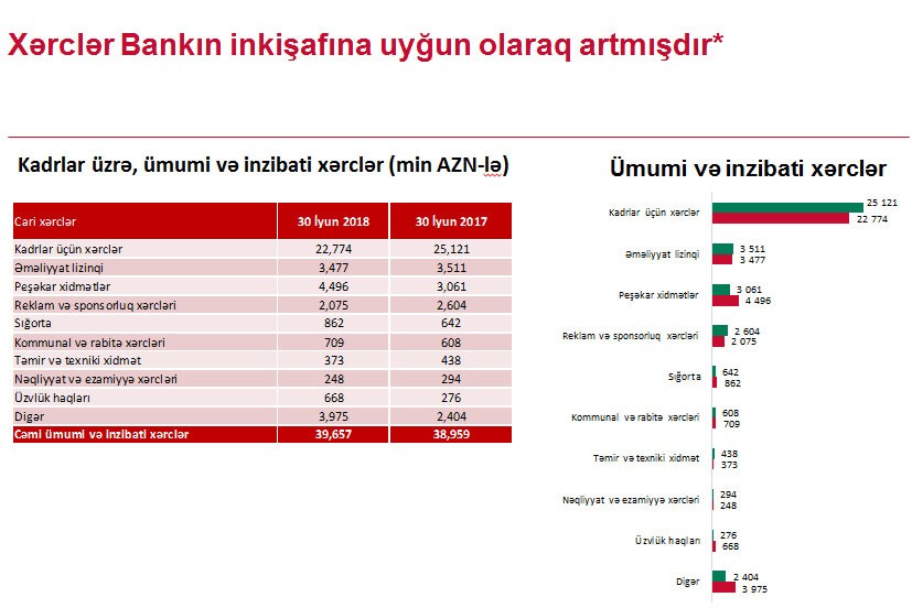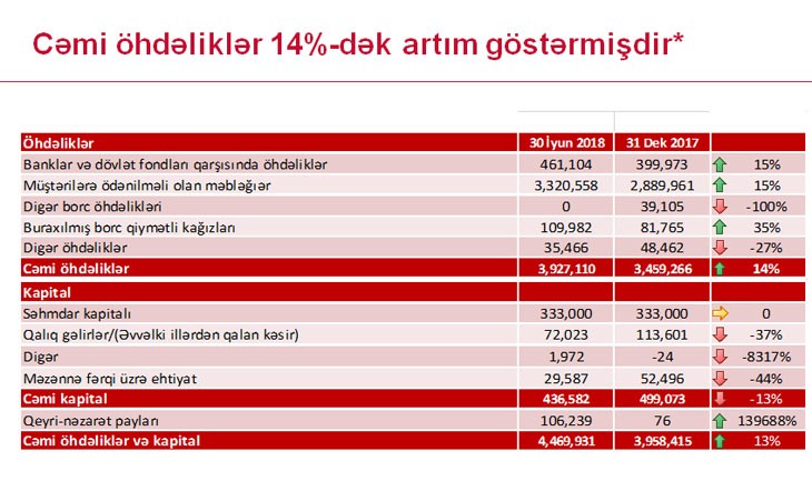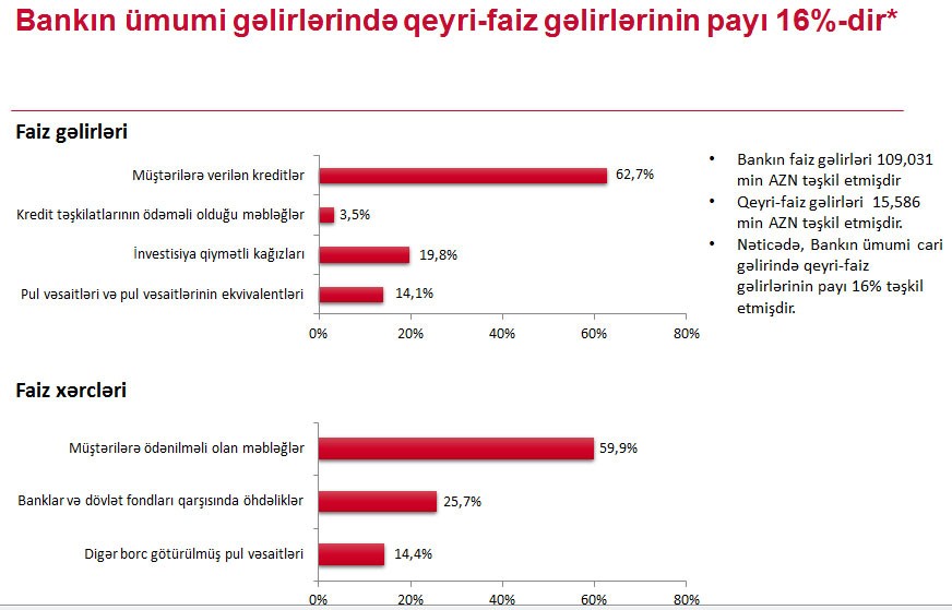 Bankın xalis mənfəəti 30 iyun 2018-ci il tarixinə bitən 6 ay üzrə 35 milyon 394 min AZN olmuşdur. Bu məbləğ keçən ilin ilk 6 ayında 50 milyon 324 min manat təşkil etmişdi. 30 İyun 2018-ci il tarixinə faiz gəlirləri 109 milyon 31 min AZN səviyyəsinə çatmışdır. 30 İyun 2017-ci il tarixinə bu məbləğ 132 milyon 453 min AZN olmuşdu.