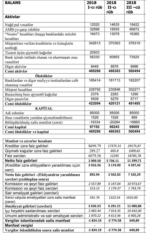 Bankı müştərilərə verdiyi kreditlər ötən ilin sonundakı 349 milyon 71 min manatdan 30 Sentyabr 2018-ci il tarixində 376 milyon 319 min manata yüksəlib (7,8% artım).