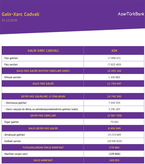 Müqayisə üçün qeyd edək ki, 2017-ci ildə“Azər-Türk Bank” ın cəmi gəlirləri 26 milyon 265 min manat (16 milyon 420 min manatı faiz, 9 milyon 845 min manatı qeyri-faiz ), xalis mənfəəti isə 1 milyon 144 min manat təşkil etmişdi. 2017-ci ildə Bankın cəmi xərcləri 25 milyon 122 min manat, o cümlədən inzibati xərcləri 16 milyon 667 min manat olmuşdu.