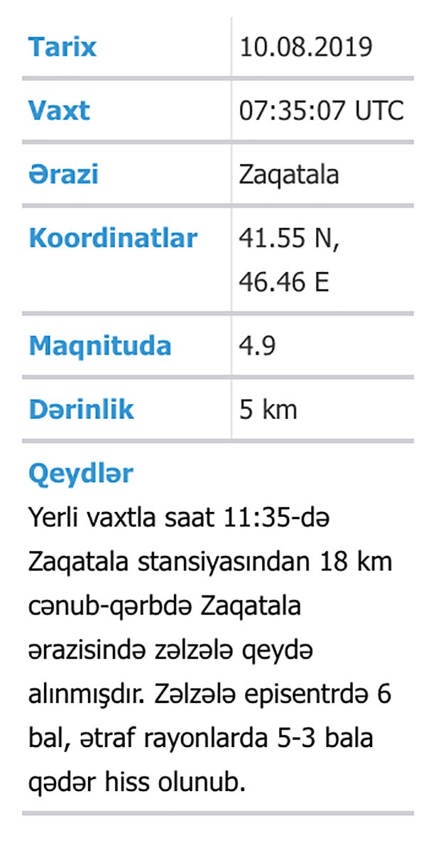 "İlkin məlumatlara əsasən yerli vaxtla saat 11:35-də Zaqatala stansiyasından 18 km cənub-qərbdə Zaqatala ərazisində zəlzələ qeydə alınmışdır. Zəlzələ episentrdə 6 bal, ətraf rayonlarda 5-3 bala qədər hiss olunub".