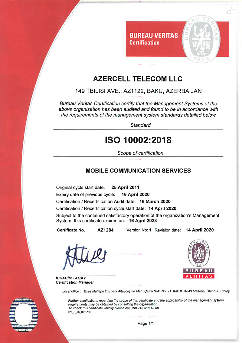 Şirkət Keyfiyyətin İdarə Olunması və Müştəri Məmnuniyyətinin Yüksəldilməsi üzrə beynəxalq sertifikat qazanıb.(®️) “Azercell Telekom” MMC ölkədə qurduğu Müştəri Xidmətləri sisteminin ən yüksək dünya standartlarına uyğun olduğunu sübut edən növbəti beynəlxalq qiymətləndirmədən keçib. Şirkət ISO 10002:2018 Keyfiyyətin İdarə Olunması /Müştəri Məmnuniyyəti /Müəssisələrdə Şikayətlərə Baxılmasına dair təlimatlar standartına uyğunluq üzrə daha bir sertifikatını əldə edib.