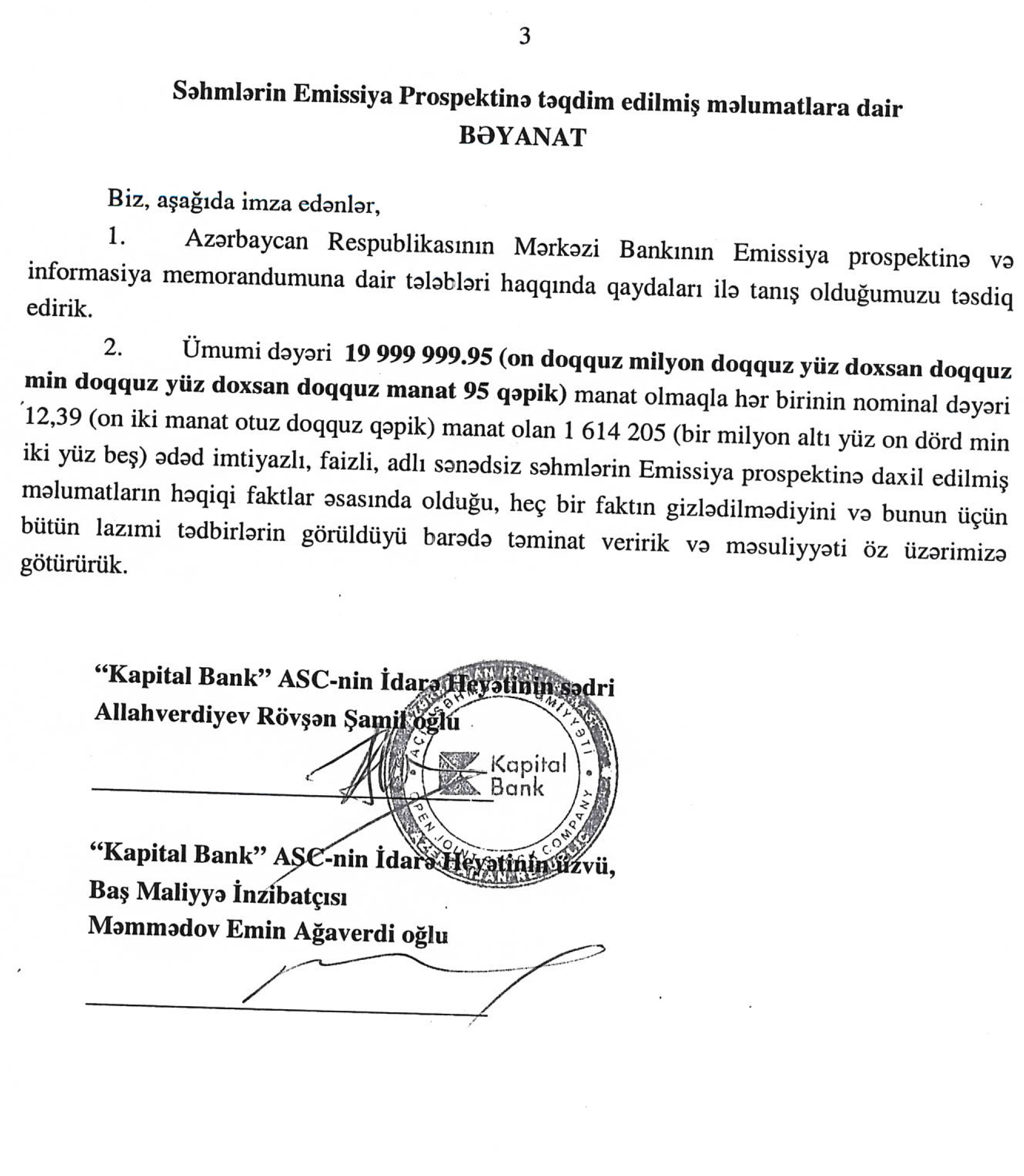 Kapital artımı üçün dövriyyəyə hər birinin nominal dəyəri 12,39 manat olan 1 614 205 ədəd yeni imtiyazlı, faizli, adlı səhm buraxılacaq.