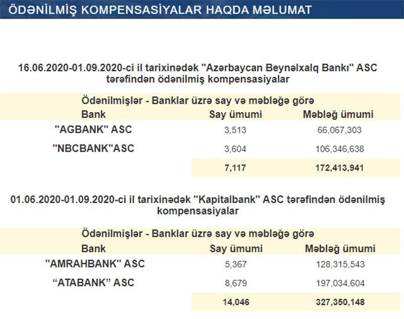 01 Sentyabr 2020-ci il tarixinə "Atabank" ASC, "Amrahbank" ASC, "NBC Bank" ASC və "AGBank" ASC-nin əmanətçilərinə 499 milyon 764 min manat 89 manat kompensasiya ödənilib.