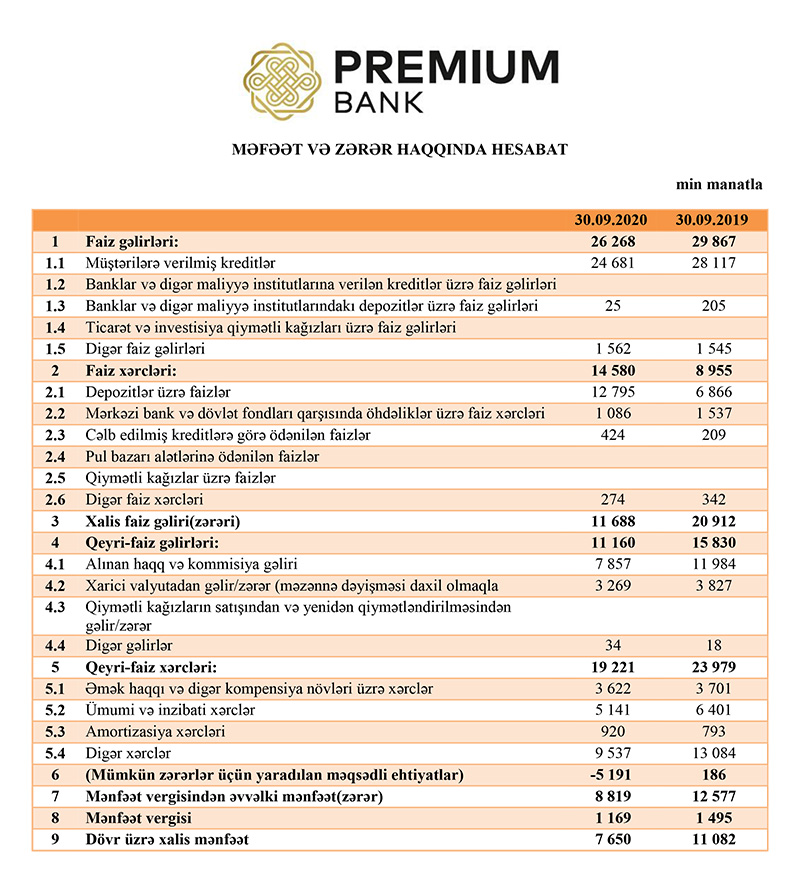 9 ay ərzində “Premium Bank”ın gəlirləri 37 milyon 428 min manat (illik müqayisədə 18,1% az), xərcləri 33 milyon 801 min manat (2,6% çox), xüsusi ehtiyatlara ayırmalar üzrə qənaəti 5 milyon 191 min manat (1 il bundan əvvəl ehtiyat yaradıb), mənfəət vergisi ödəmələri isə 1 milyon 169 min manat (21,8% az) təşkil edib.