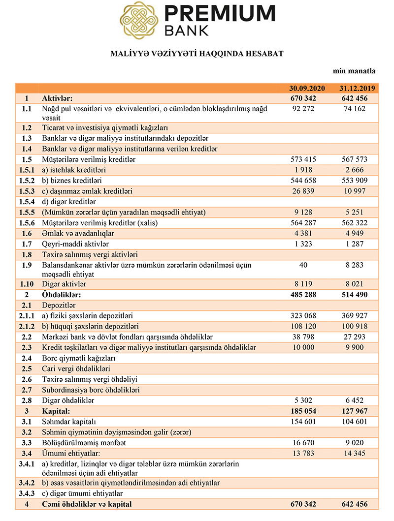 “Premium Bank”ın maliyyə vəziyyəti məlum oldu