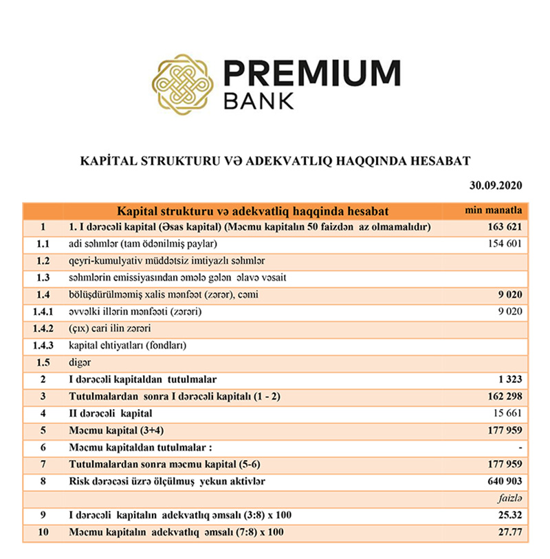 Hesabat dövründə “Premium Bank”ın öhdəlikləri 8,8% artaraq 485 milyon 288 min manata, o cümlədən depozit portfeli 8,6% artaraq 431 milyon 188 min manata, balans kapitalı isə 41,9% artıraraq 185 milyon 54 min manata, o cümlədən nizamnamə kapitalı 47,8% artaraq 154 milyon 601 min manata çatıb.