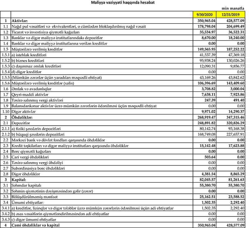 Qeyd edilib ki, Bankın 2020-ci ilin üçüncü rübünə dair açıqladığı hesabata əsasən xalis faiz gəlirləri 19.8 mln AZN olmuşdur.