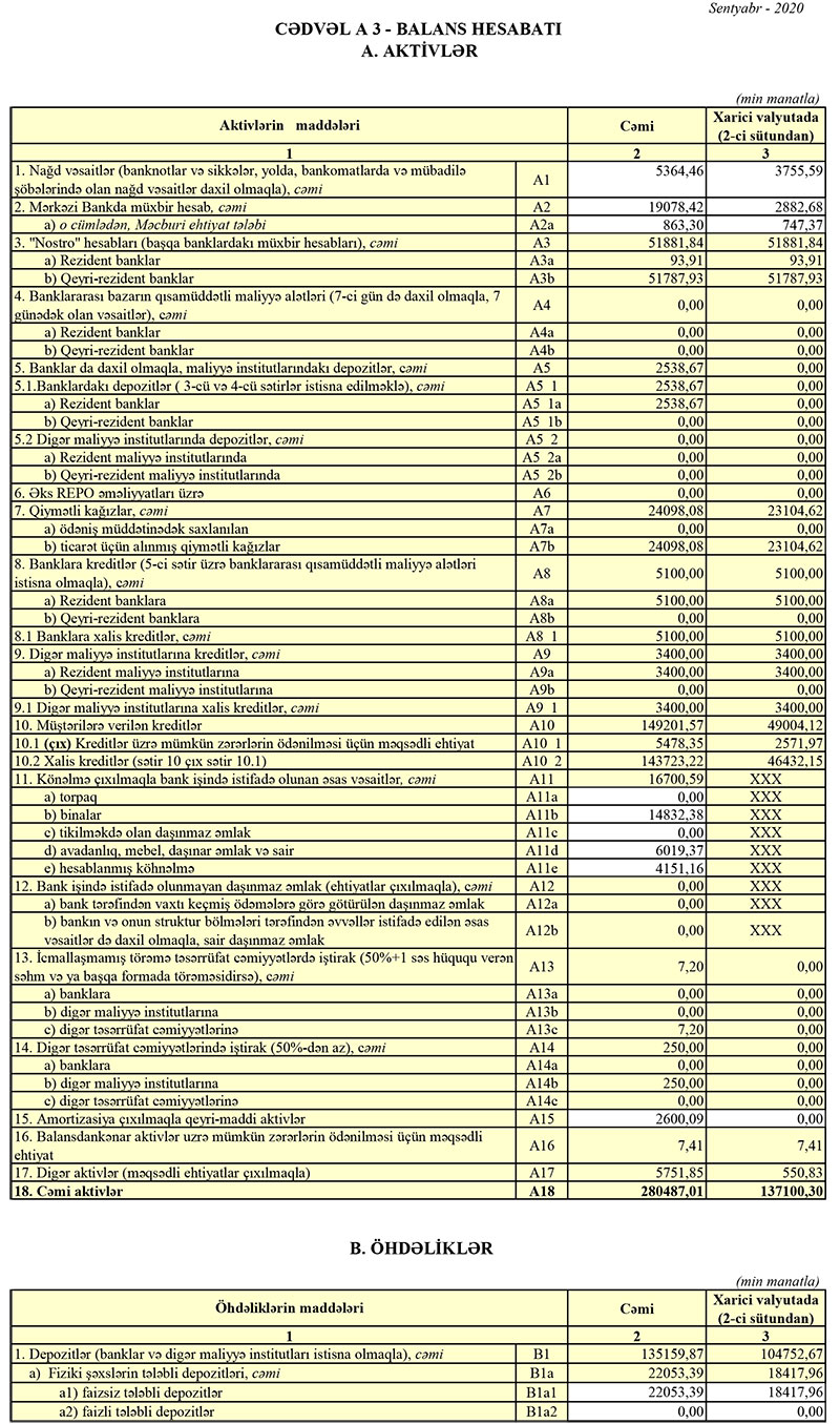 2019-cu ilin sonunda “Ziraat Bank Azərbaycan”ın cəmi aktivlər 253 milyon 491 min manat, müştərilərə verilən kreditlər isə 145 milyon 434 min manat təşkil etmişdi. Beləliklə, 2020-ci ilin 9 ayı ərzində “Ziraat Bank Azərbaycan”ın cəmi aktivləri 26 milyon 996 min manat və ya 10,6%, müştərilərə verilən kreditlər isə 3 milyon 767 min manata və ya 2,6% artıb.