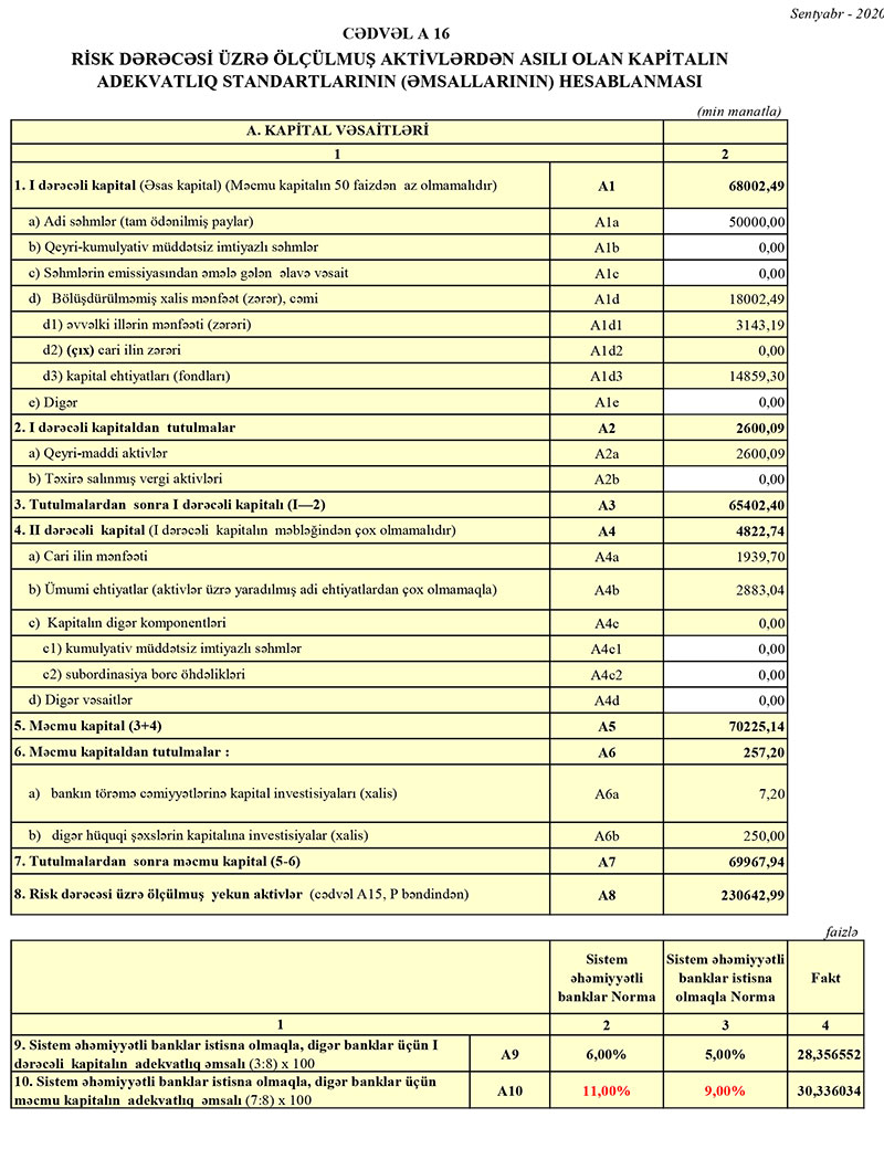 30 Sentyabr 2020-ci il tarixində “Ziraat Bank Azərbaycan” 69 milyon 968 min manat məcmu kapitala malik olub. Ötən ilin sonu ilə müqayisədə Bankın məvmu kapitalı 2 milyon 122 min manat və ya 3,1% artıb.