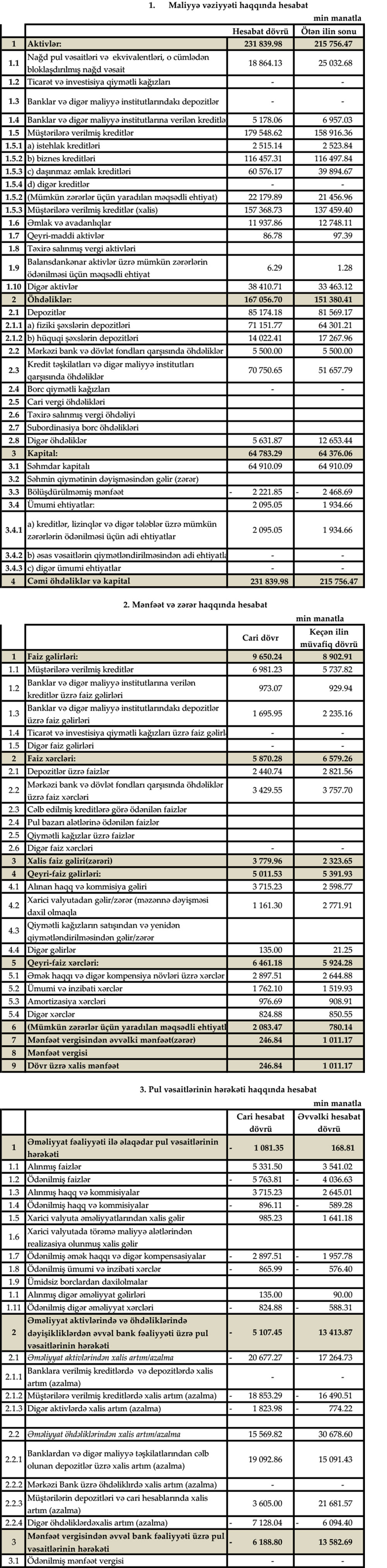 Bankın cəmi əməliyyat gəlirlərinin 366 min manat artması ilə bərabər əməliyyat xərcləri 172 min manat azalıb, nəticədə Bankın əməliyyat mənfəəti ötən ilin 9 ayı ilə müqayisədə 2020-ci ilin 9 ayında 538 min manat yüksək olub.