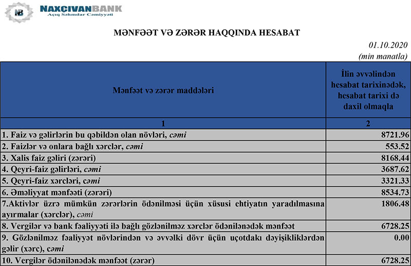 Müqayisə üçün qeyd edək ki, 2019-cu ilin yanvar-sentyabr dövründə “Naxçıvanbank”ın cəmi əməliyyat gəlirləri 8 milyon 339 min manat, cəmi əməliyyat xərcləri 3 milyon 577 min manat təşkil etmiş, nəticədə Bankın 4 milyon 762 min manat əməliyyat mənfəəti formalaşmışdı. Əməliyyat mənfəətindən 358 min manat aktivlər üzrə mümkün zərərlərin ödənilməsi üçün xüsusi ehtiyatın yaradılmasına ayrılmışdı. Bank 9 ay ərzində mənfəət vergisi ödəmədiyindən 4 milyon 404 min manat xalis mənfəət əldə etmişdi.
